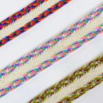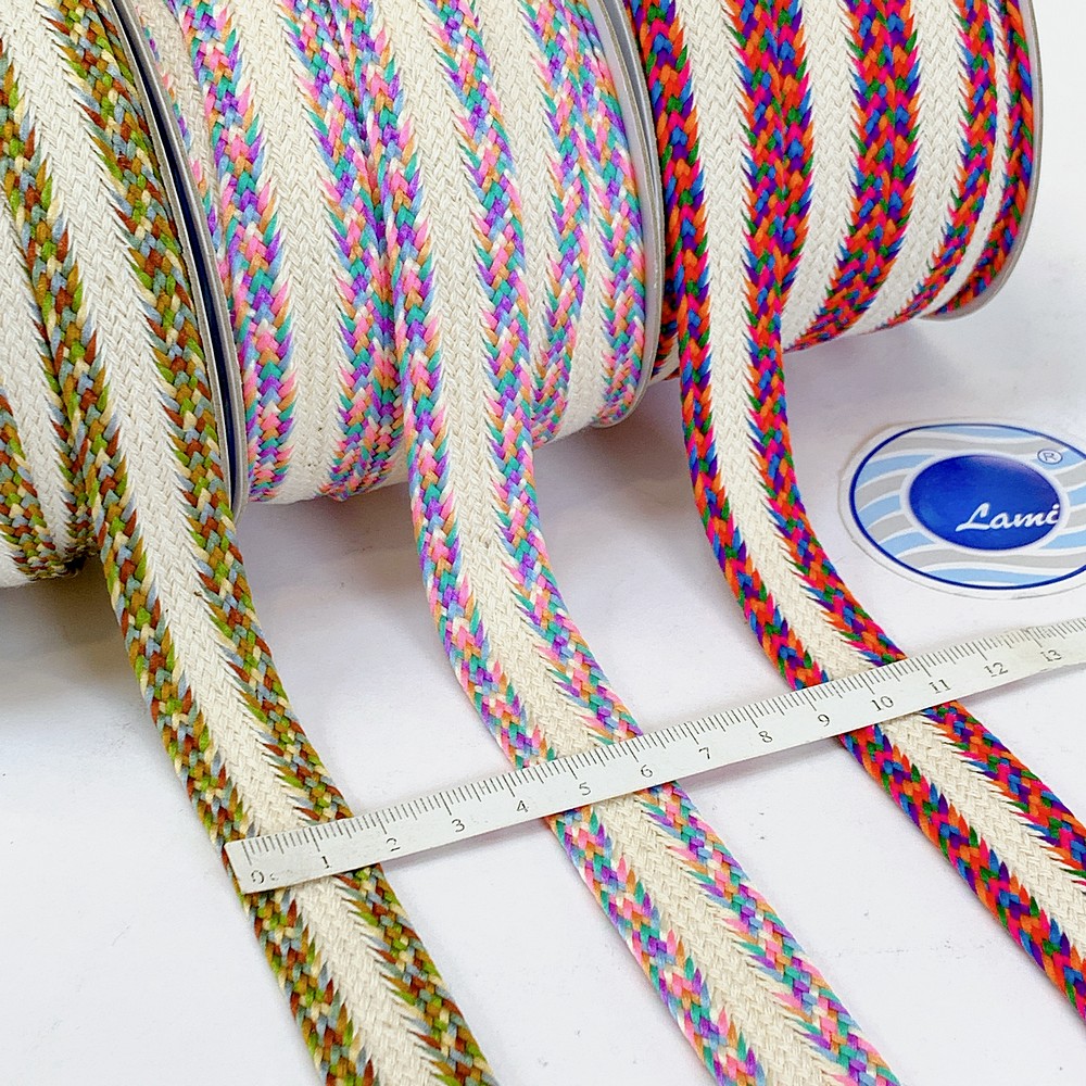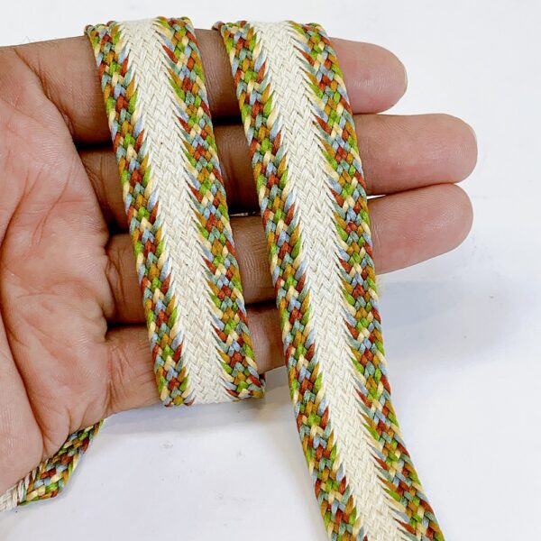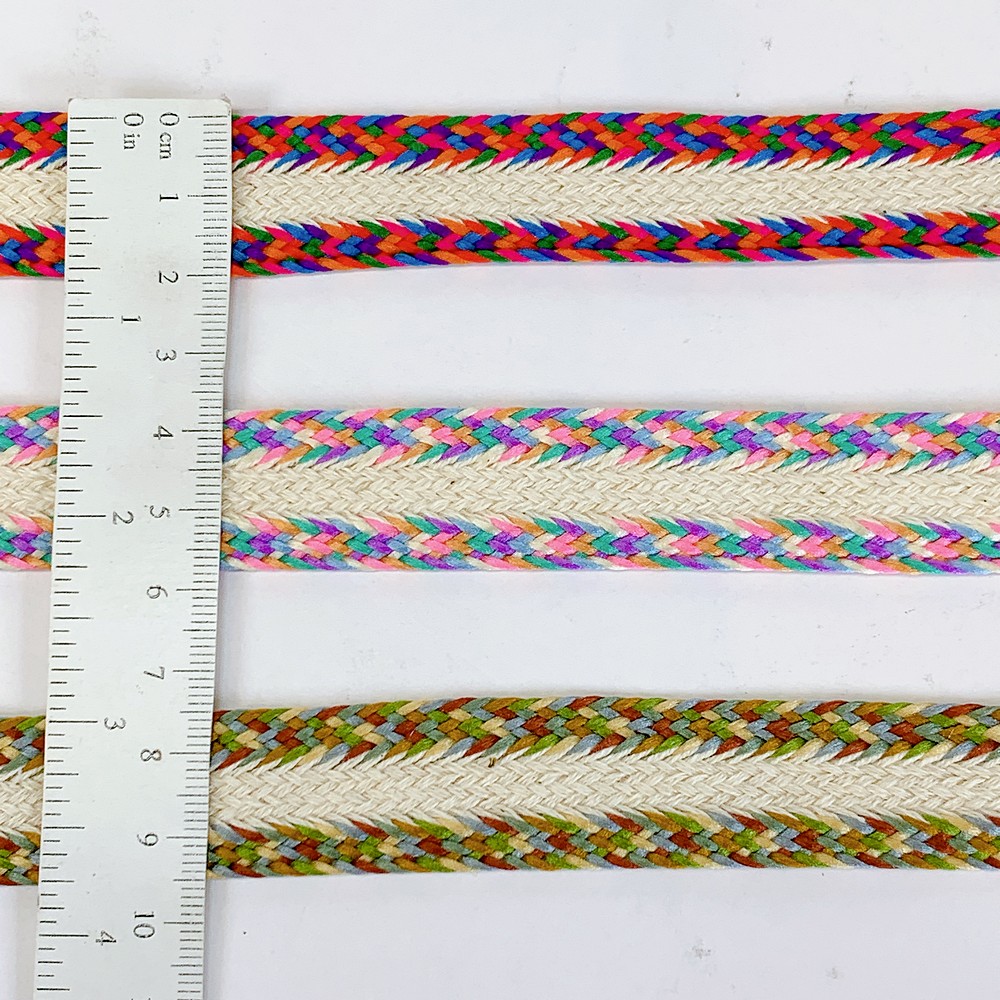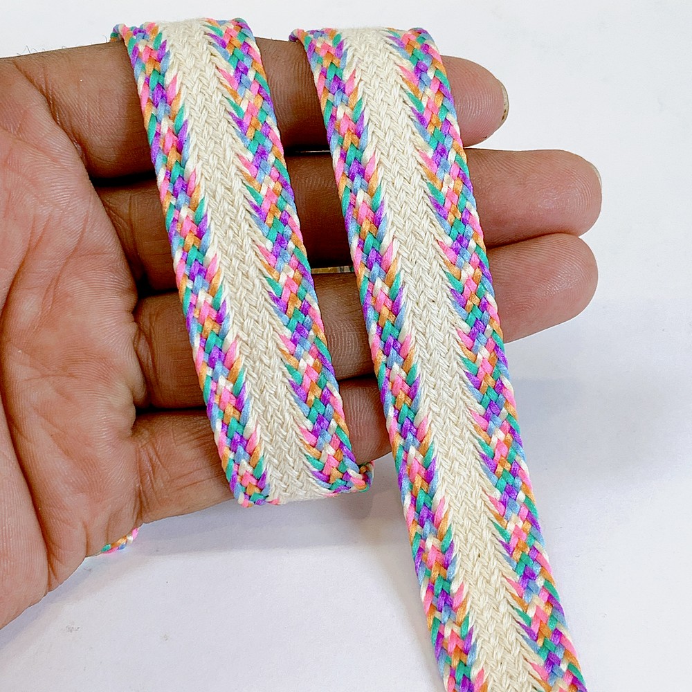 Colorful braided lace trim featuring a woven cream center, ideal for ethnic wear, accessories, crafts, and garment design. Durable, eye-catching, and perfect for statement embellishments.