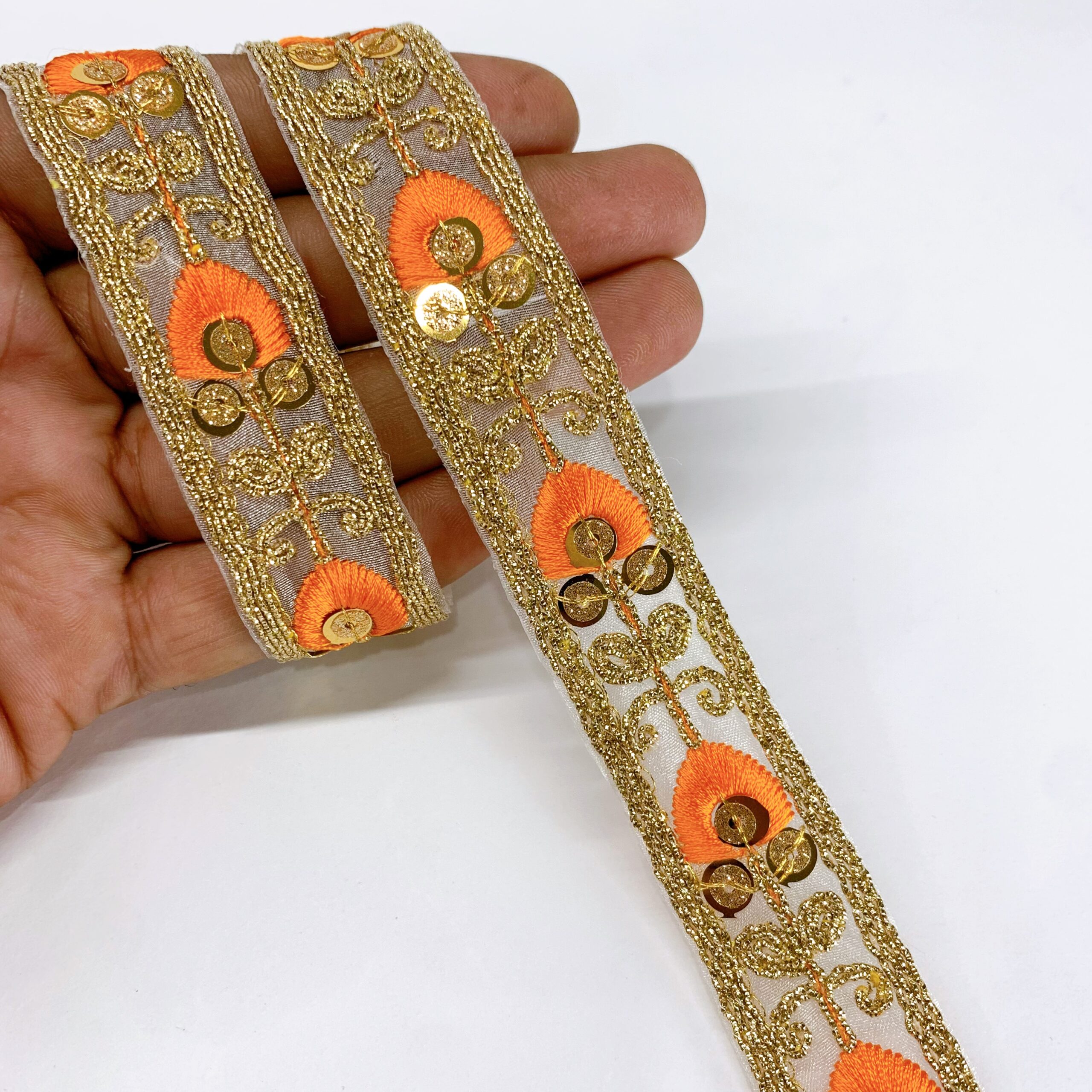 20mm Orange Leaf Design Embroidery lace with Golden Sequins and Dori Work Border - 9.00 meters