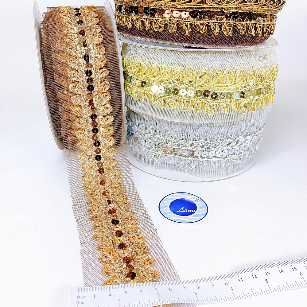 Lami – 62 mm The Designer embroidery lace with Sequins work is a masterpiece of artistic craftsmanship, designed to elevate your attire with its exquisite beauty and elegance. This lace features intricate embroidery meticulously crafted onto fine fabric, showcasing a mesmerizing array of patterns, motifs, and designs. The addition of Sequins work enhances the allure of the lace, creating a subtle shimmer and sparkle that catches the eye. Each Sequins is carefully placed to complement the embroidery, adding depth and dimension to the overall design. Perfect for embellishing sarees, lehengas, dupattas, or any other traditional outfit, this designer lace adds a touch of glamour and sophistication to your ensemble. Whether it’s a wedding, festive occasion, or formal event, this lace effortlessly enhances your style, making you stand out with its refined detailing and impeccable craftsmanship. With its timeless appeal and versatile charm, the designer embroidery lace with Sequins work is a true symbol of luxury and refinement, elevating your look with its sheer beauty and elegance.
