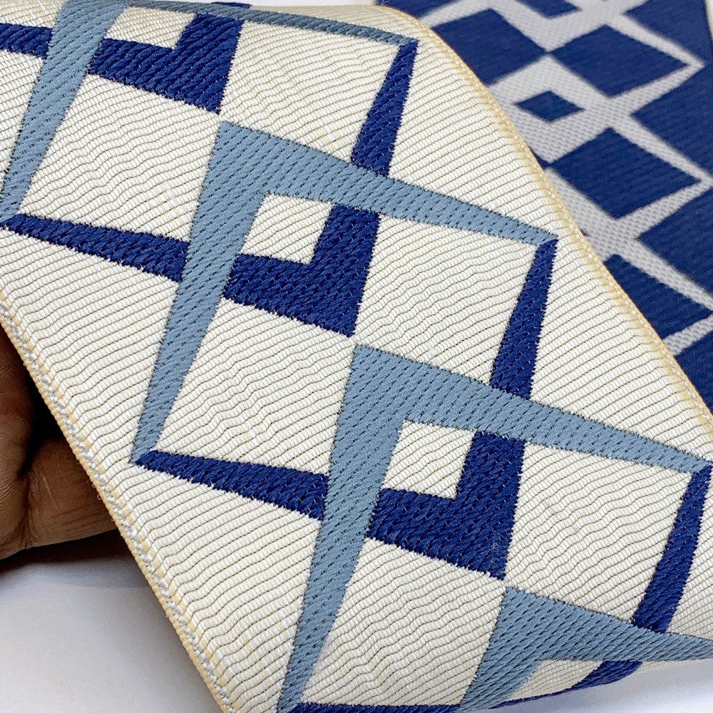 A refined tapestry tape featuring an intricate geometric pattern, perfect for adding a modern touch to fashion, upholstery, and d?cor projects. With a width of 90mm, this premium-quality trim is available in a variety of sophisticated colorways to complement any design aesthetic.