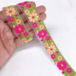 20mm peach and pink Organza back flower creeper Jacquard trim is a stunning embellishment that can be used to add a touch of elegance and sophistication to any saree, dress, or other traditional Indian clothing. The 9-meter length of the makes it ideal for larger garments like sarees, as it can be sewn onto the edge of the fabric to create a stunning and unique look. Creeper Flower Jacquard is a stunning embellishment that can be used to add a touch of elegance and sophistication to any saree, dress, or other traditional Indian clothing.In addition to traditional Indian clothing, this can also be used for gift wrapping and decoration. It can be used to create beautiful and unique gift wrapping for special occasions.