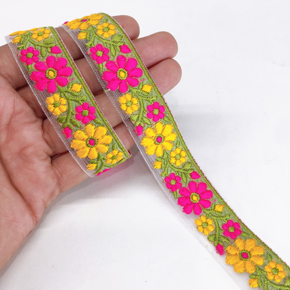 20mm yellow and pink Organza back flower creeper Jacquard trim is a stunning embellishment that can be used to add a touch of elegance and sophistication to any saree, dress, or other traditional Indian clothing. The 9-meter length of the makes it ideal for larger garments like sarees, as it can be sewn onto the edge of the fabric to create a stunning and unique look. Creeper Flower Jacquard is a stunning embellishment that can be used to add a touch of elegance and sophistication to any saree, dress, or other traditional Indian clothing.In addition to traditional Indian clothing, this can also be used for gift wrapping and decoration. It can be used to create beautiful and unique gift wrapping for special occasions.