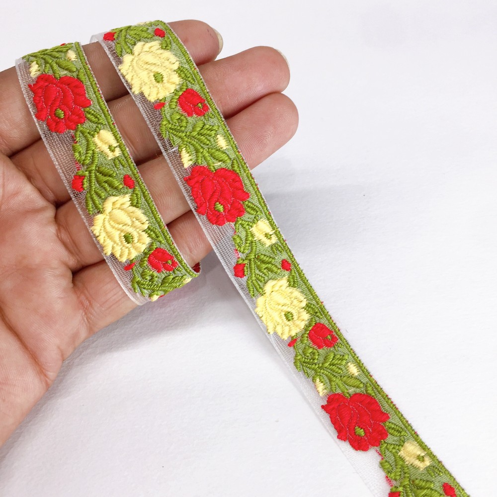20mm yellow and red flower creeper vine Jacquard trim is a stunning embellishment that can be used to add a touch of elegance and sophistication to any saree, dress, or other traditional Indian clothing. The 9-meter length of the makes it ideal for larger garments like sarees, as it can be sewn onto the edge of the fabric to create a stunning and unique look. Creeper Flower Jacquard is a stunning embellishment that can be used to add a touch of elegance and sophistication to any saree, dress, or other traditional Indian clothing.In addition to traditional Indian clothing, this can also be used for gift wrapping and decoration. It can be used to create beautiful and unique gift wrapping for special occasions.