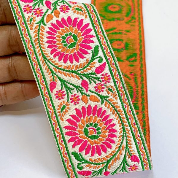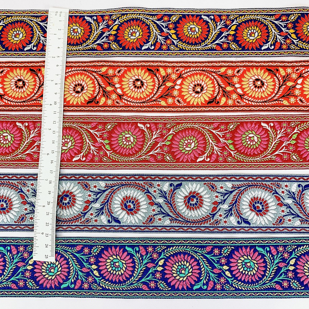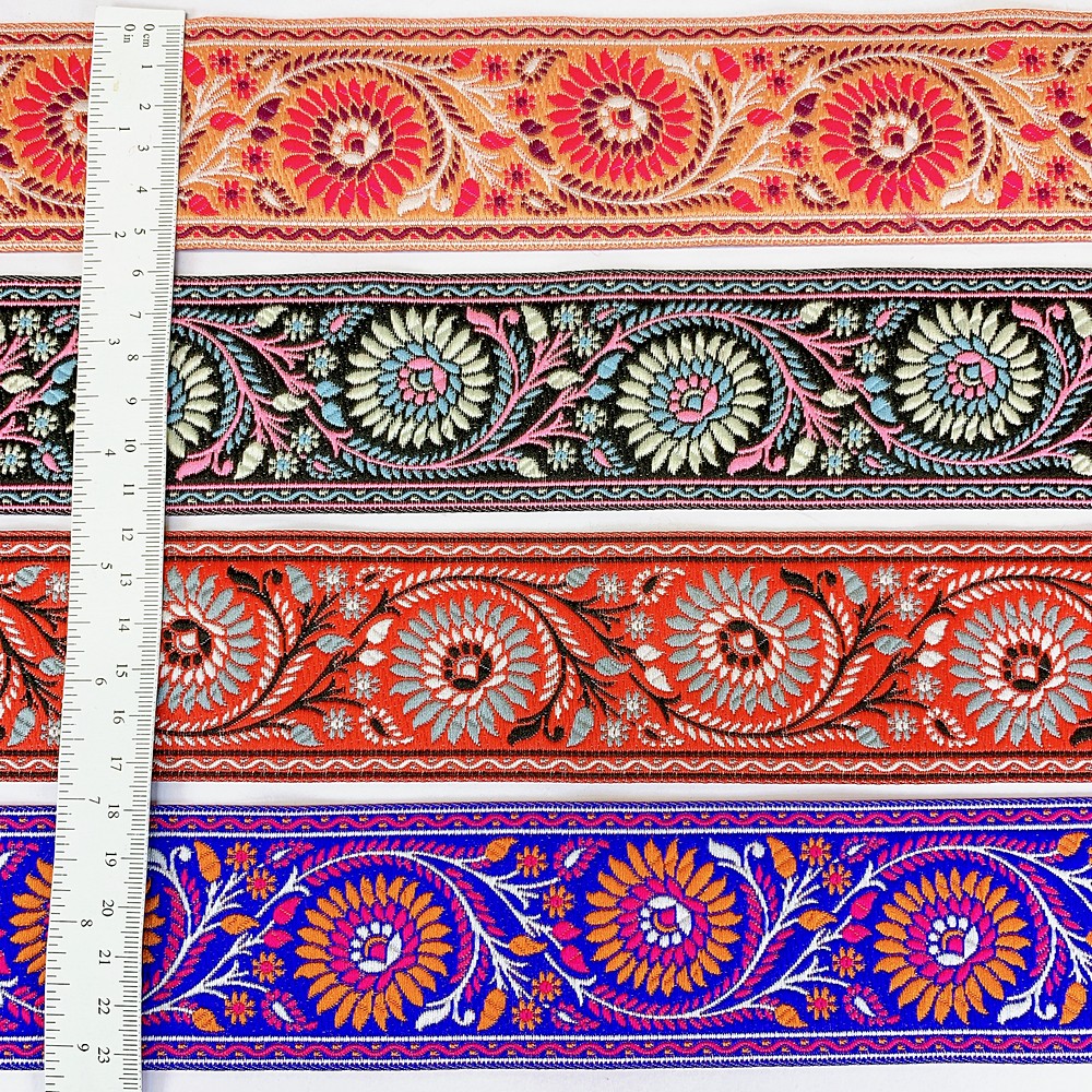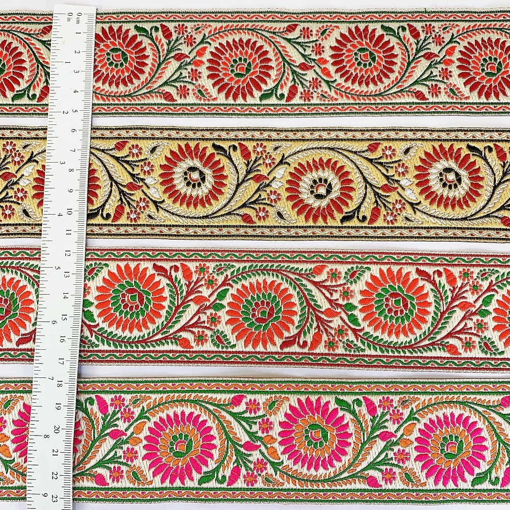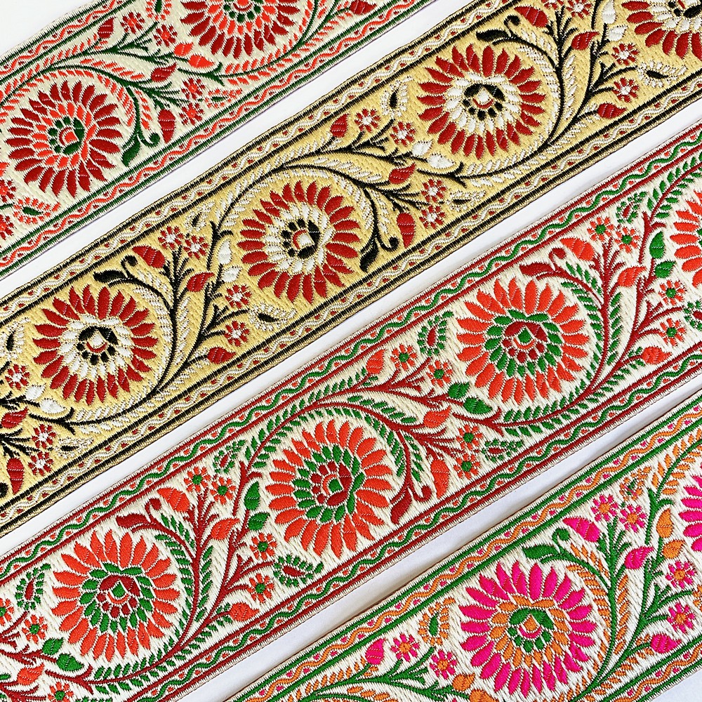 55mm Premium Floral Woven Jacquard Ribbon | Sunflower Motif Ethnic Trim | 2.2-Inch Multi-Color Jacquard Border for Garments - 09.00 Meters