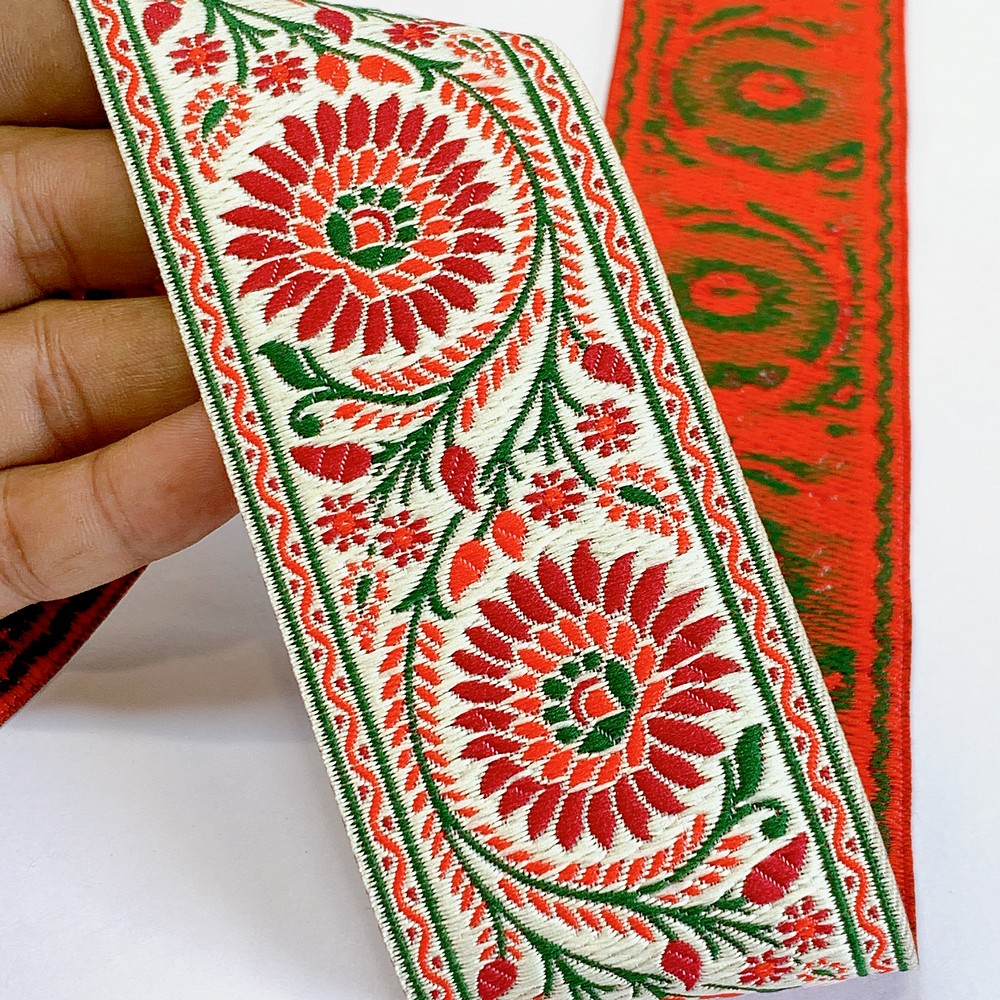 55mm Premium Floral Woven Jacquard Ribbon | Sunflower Motif Ethnic Trim | 2.2-Inch Multi-Color Jacquard Border for Garments - 09.00 Meters