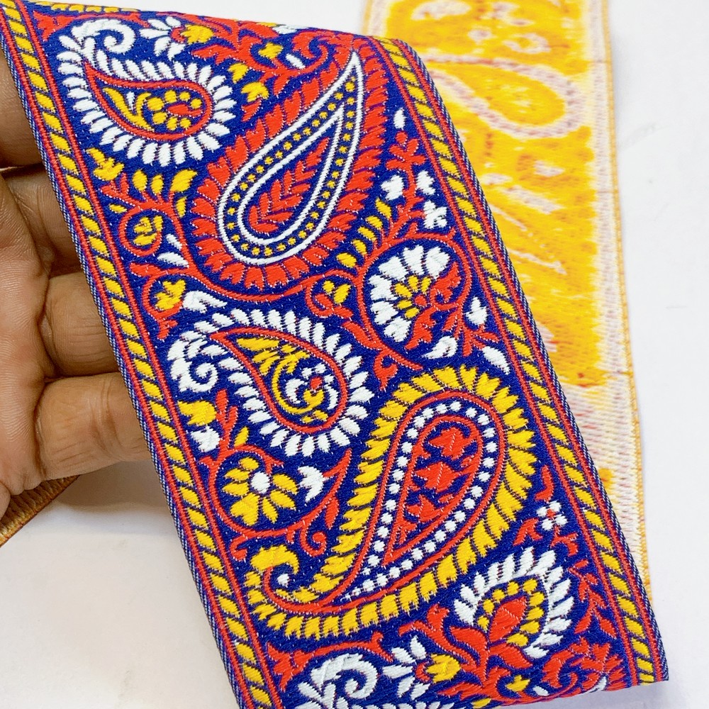 74mm Premium Woven Jacquard Paisley Ribbon | High-Density Ethnic Trim | Paisley Border for Garments and Accessories - 09.00 Meters