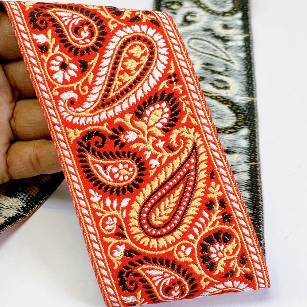 74mm Premium Woven Jacquard Paisley Ribbon | High-Density Ethnic Trim | Paisley Border for Garments and Accessories - 09.00 Meters