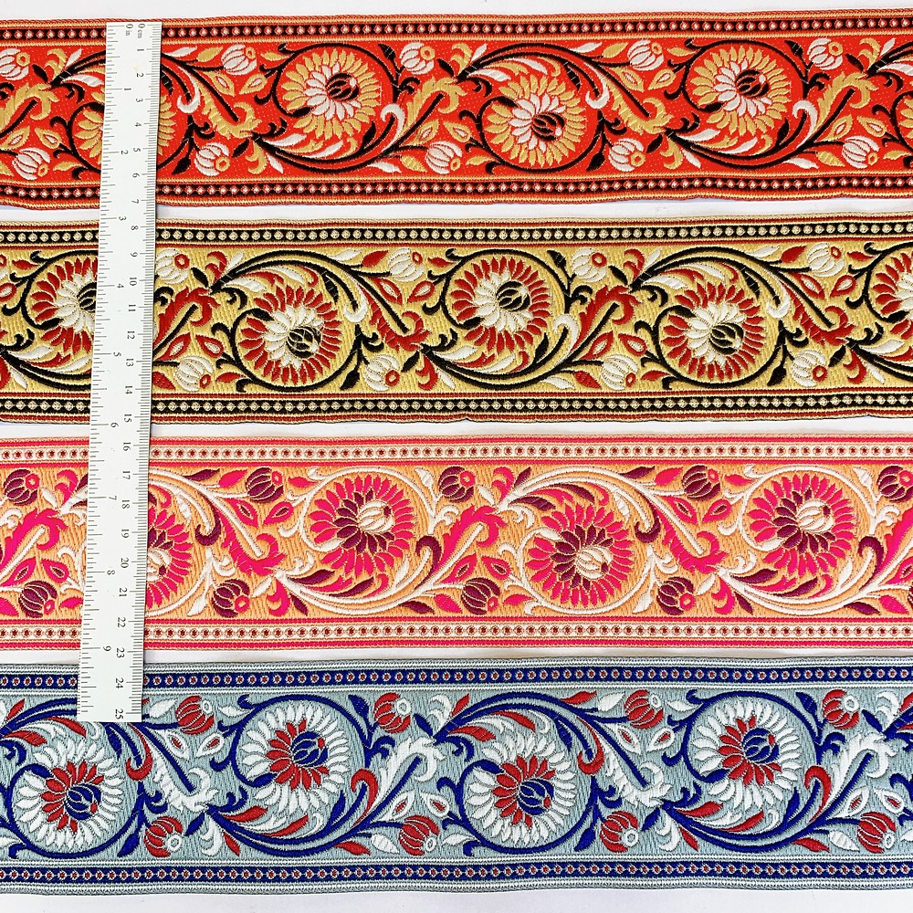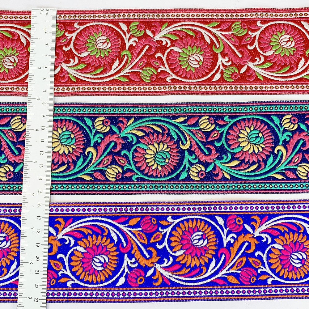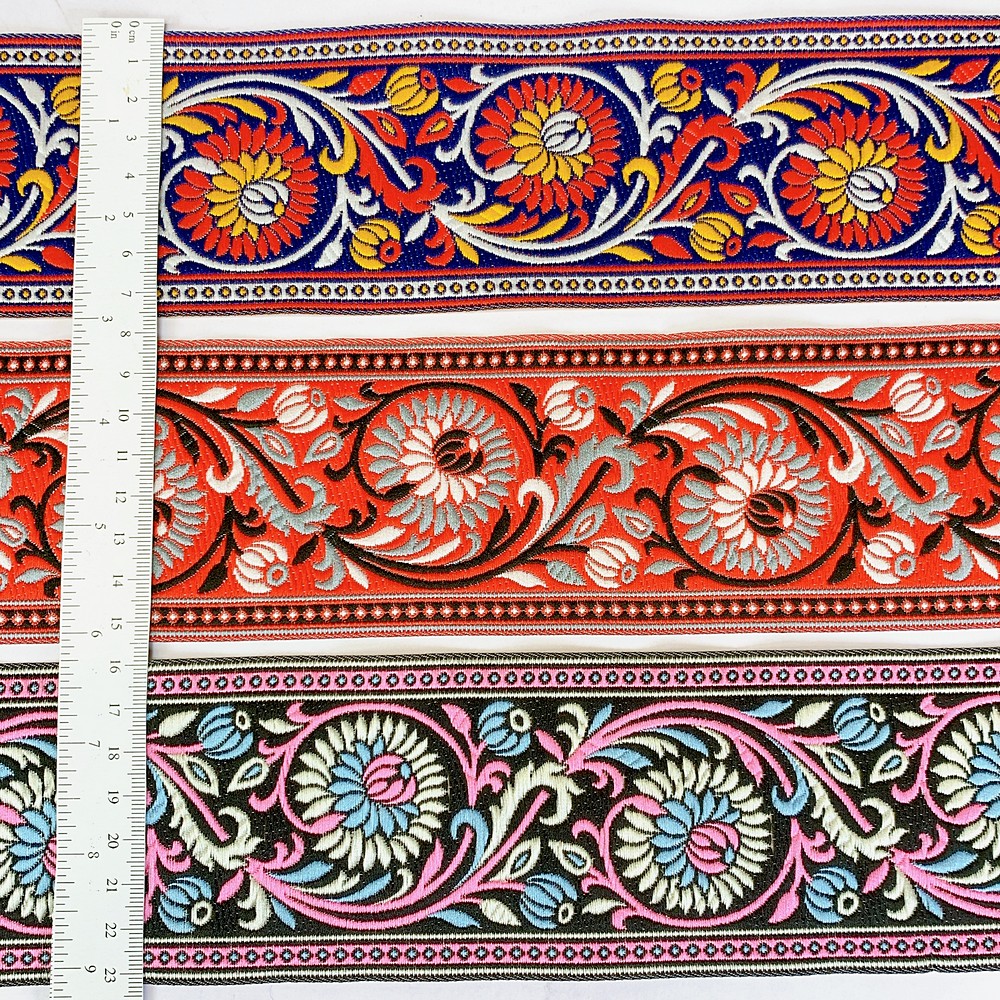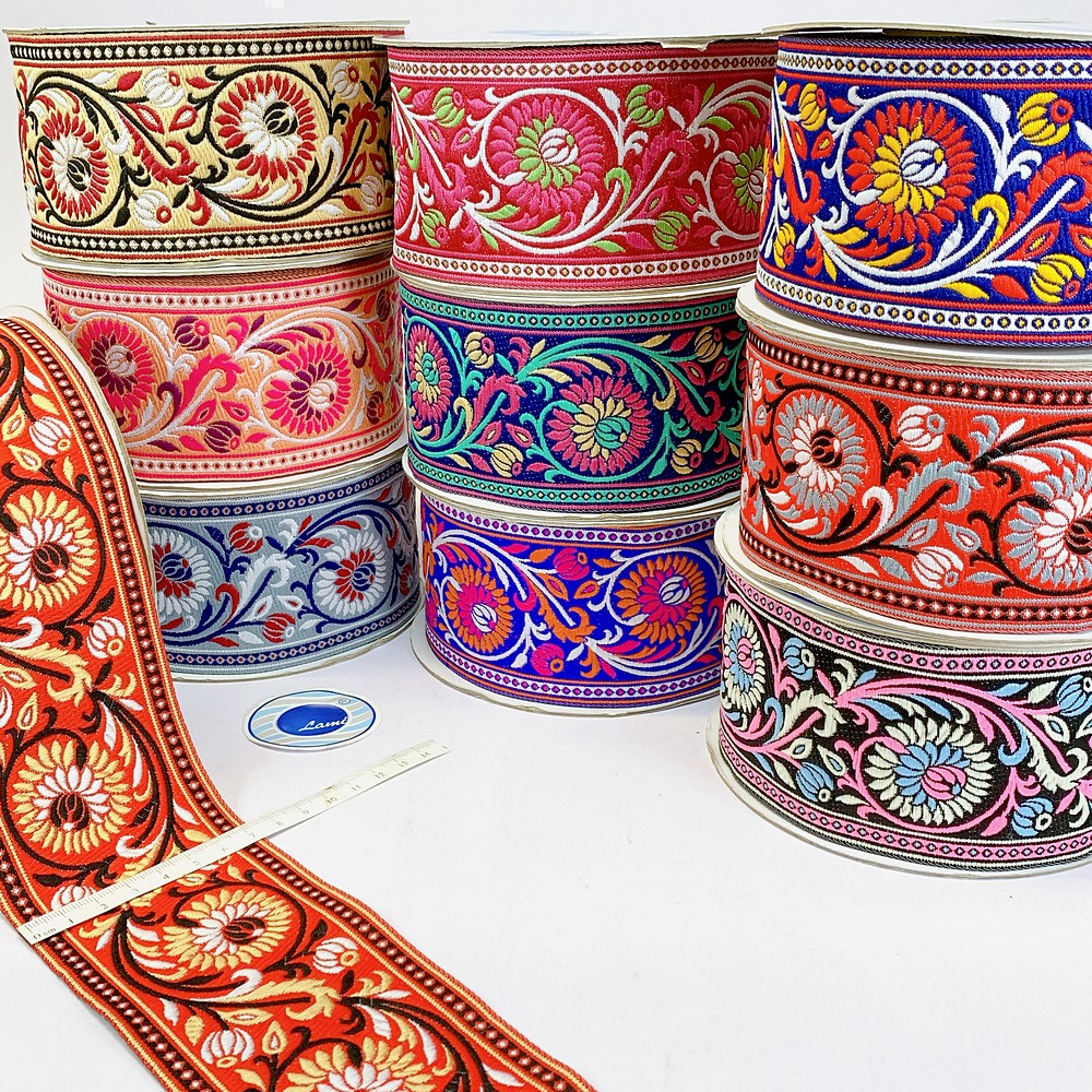 Elevate your fashion line with our 74mm Woven Jacquard Ribbon, featuring an elegant Lotus and swirling vine motif. This high-density woven trim is designed for professional use, offering a smooth, flat finish that is integrated into the fabric rather than stitched on top. This ensures a snag-resistant, long-lasting border with a premium look and feel.