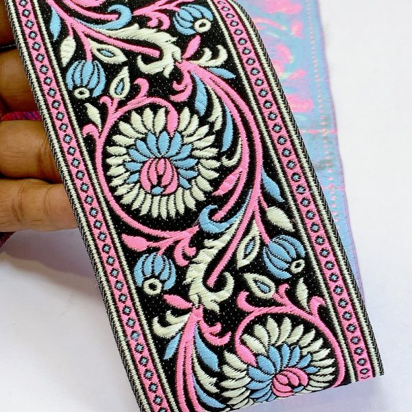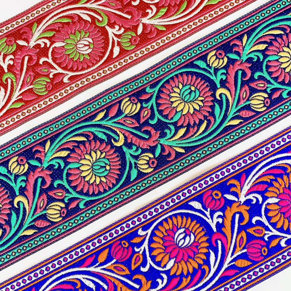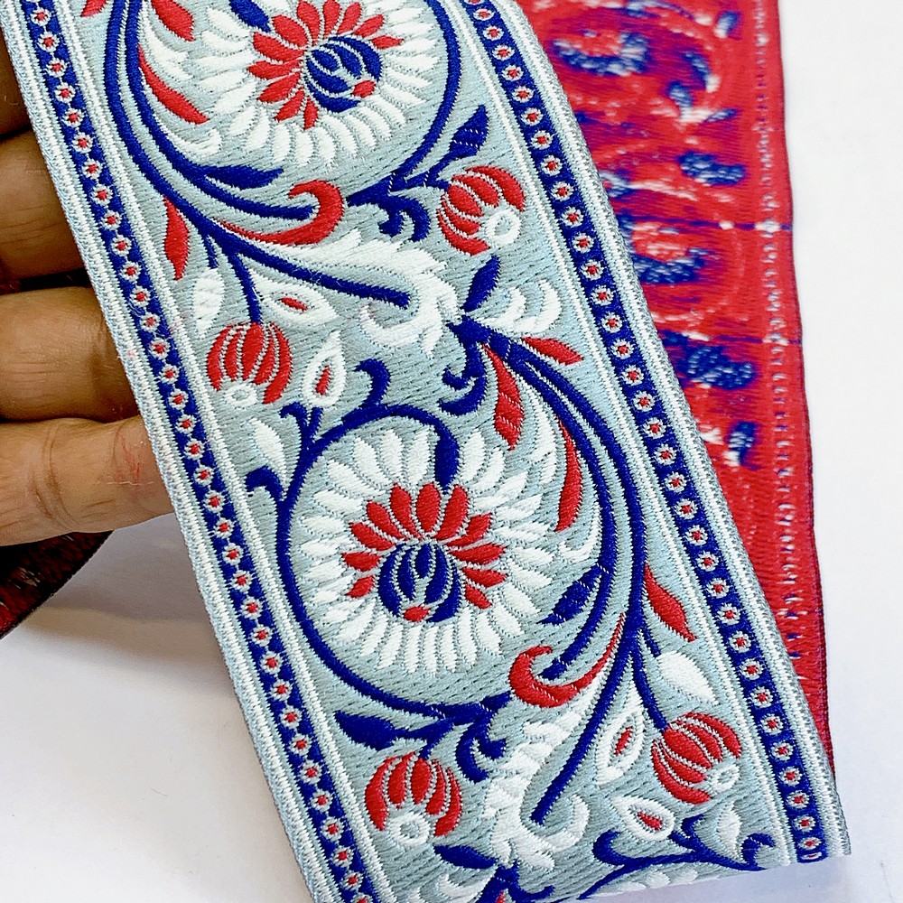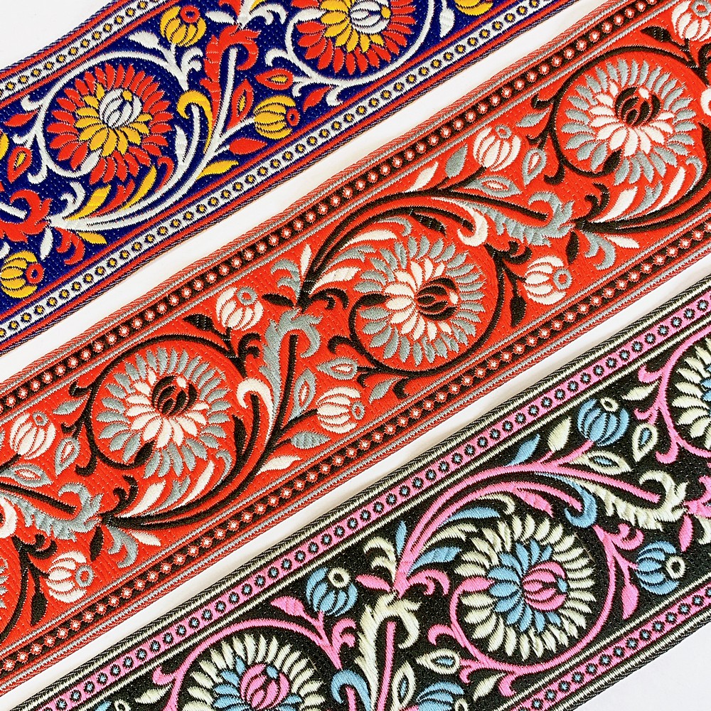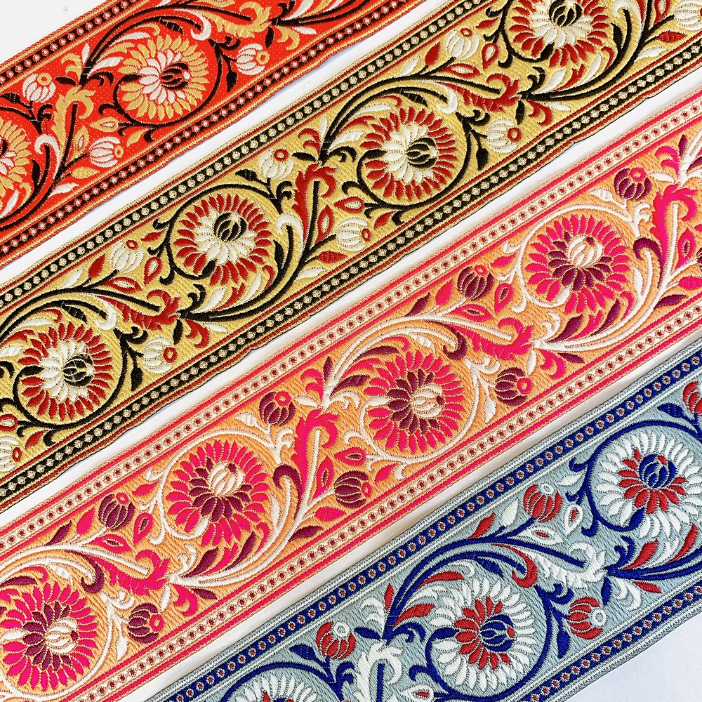 Elevate your fashion line with our 74mm Woven Jacquard Ribbon, featuring an elegant Lotus and swirling vine motif. This high-density woven trim is designed for professional use, offering a smooth, flat finish that is integrated into the fabric rather than stitched on top. This ensures a snag-resistant, long-lasting border with a premium look and feel.