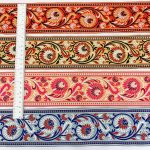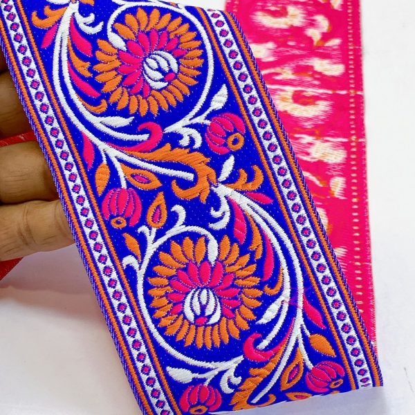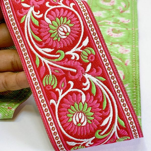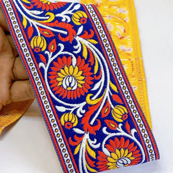 74mm Woven Jacquard Lotus & Vine Ribbon | Premium Ethnic Floral Trim | Wide Multi-Color Jacquard Border for Garments - 09.00 Meters