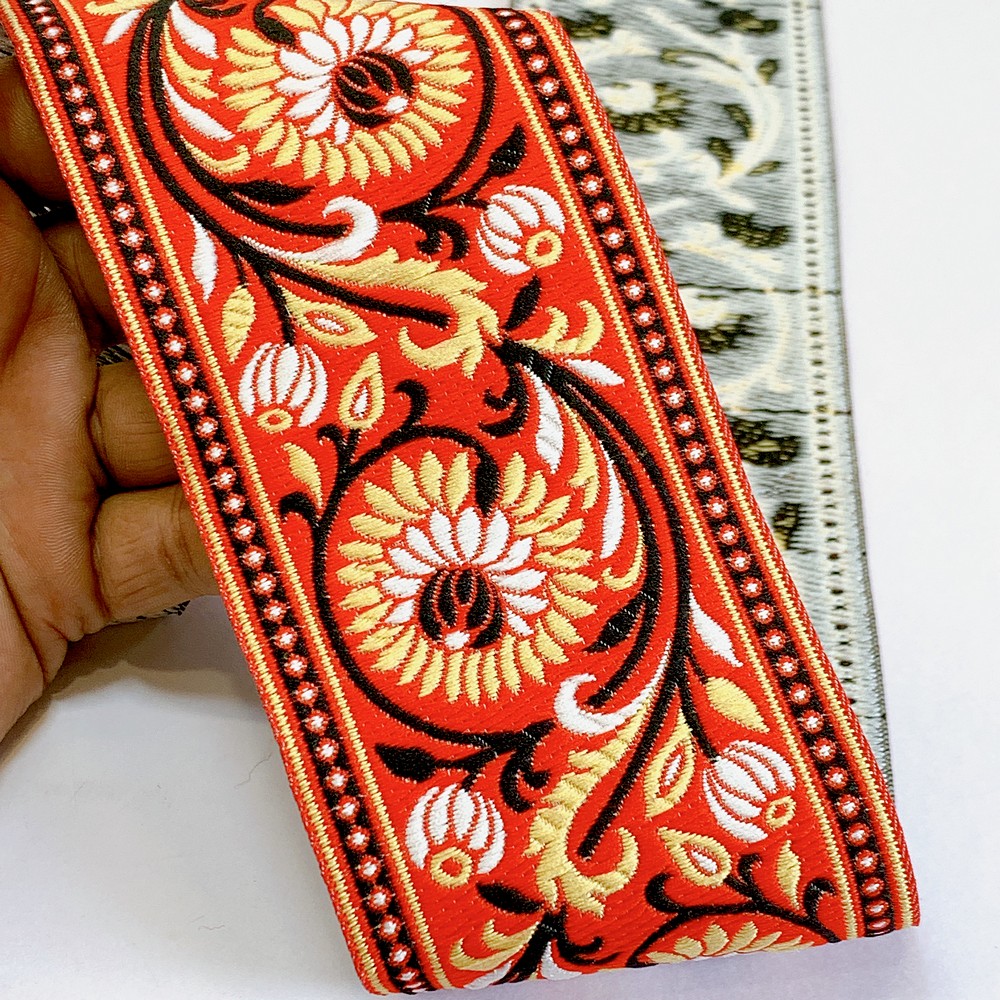 74mm Woven Jacquard Lotus & Vine Ribbon | Premium Ethnic Floral Trim | Wide Multi-Color Jacquard Border for Garments - 09.00 Meters