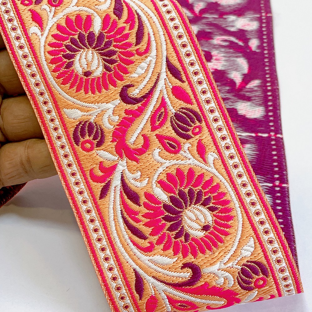 74mm Woven Jacquard Lotus & Vine Ribbon | Premium Ethnic Floral Trim | Wide Multi-Color Jacquard Border for Garments - 09.00 Meters