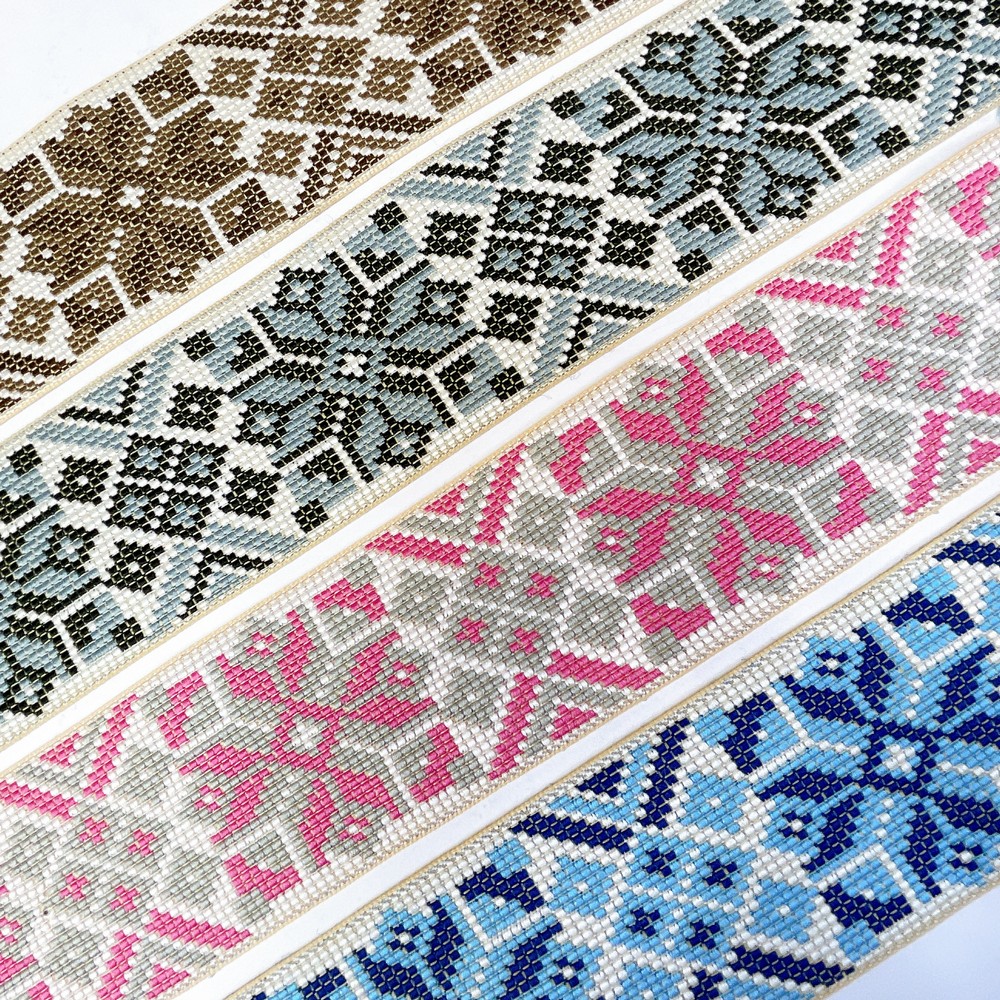 Where tradition meets contemporary craft. Our latest Jacquard Ribbon collection mimics the timeless beauty of artisanal cross-stitch embroidery. Designed for the discerning designer, these borders add a rich, textured dimension to any silhouette. From deep jewel tones to subtle neutrals, this collection is engineered to provide a sophisticated finish to bridal wear and upscale couture.
