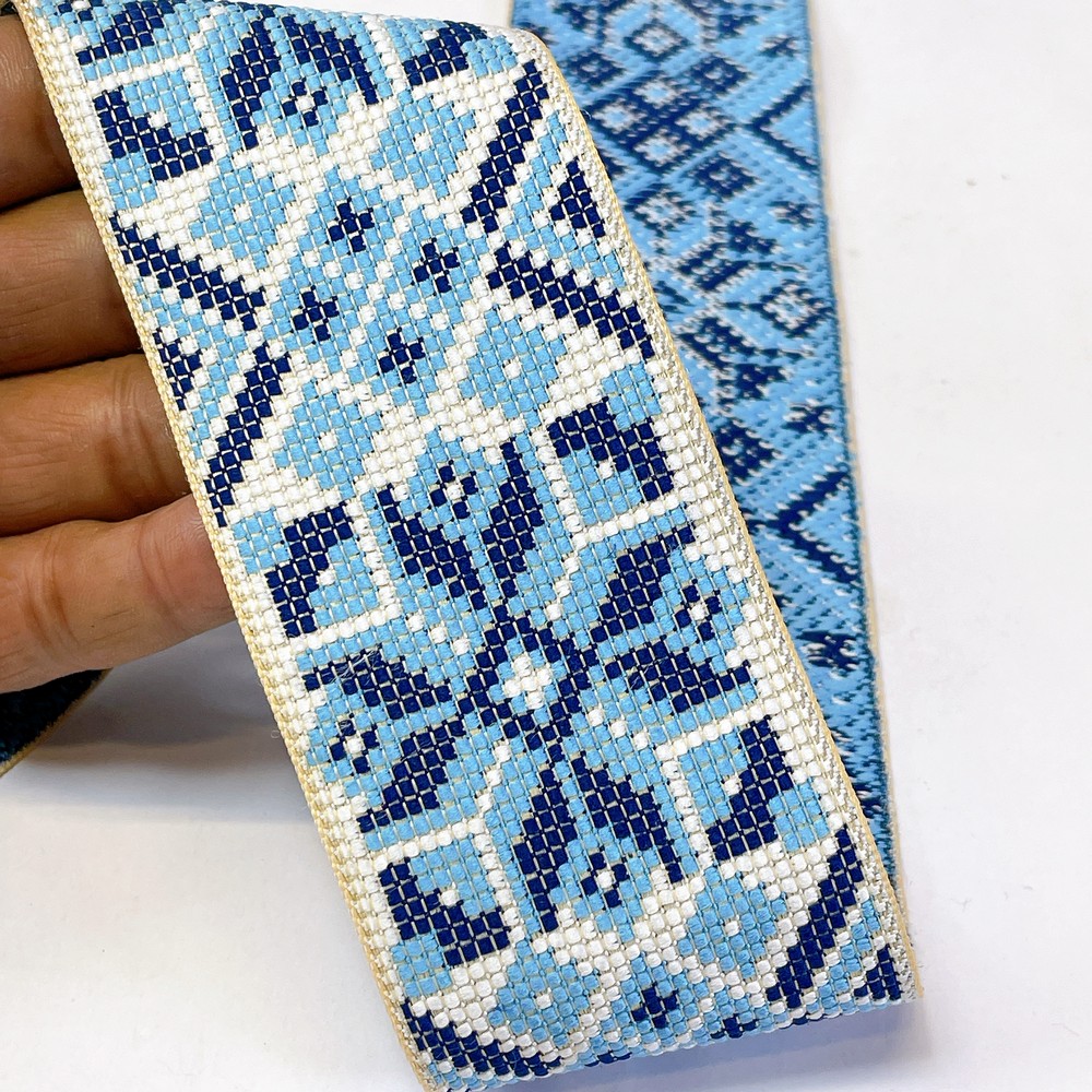 52mm Premium Cross-Stitch Jacquard Ribbon – Ethnic Geometric Border Lace for Garments & Crafts - 09.00 Meters