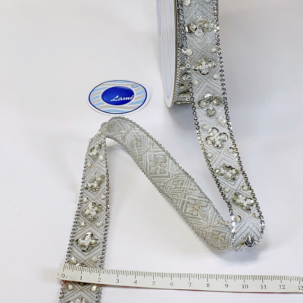 Lami – 22 mm Indulge in the opulent beauty of our Designer Jacquard Lace, adorned with exquisite Sequins and Bead Work, where every stitch is a testament to intricate craftsmanship. This masterpiece of textile artistry combines the rich texture of jacquard weaving with the dazzling sparkle of sequins and the subtle elegance of beads. Each thread intricately woven to create a luxurious lace pattern, meticulously embellished with shimmering sequins and delicate beads that dance in the light, adding depth and dimension to the design. Whether draped gracefully over the shoulders or incorporated into your ensemble as a statement piece, this lace exudes timeless sophistication and glamour. Elevate your style with the enchanting fusion of tradition and contemporary allure embodied in our Designer Jacquard Lace with Sequins and Bead Work.