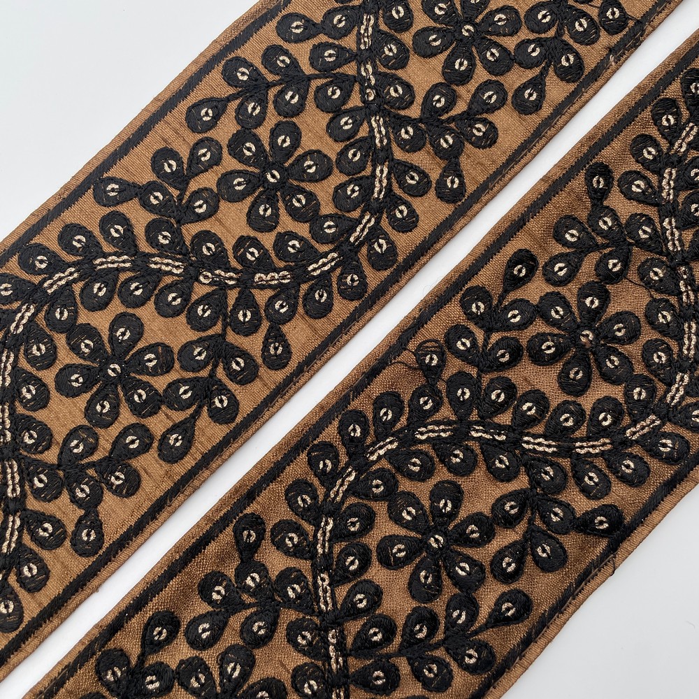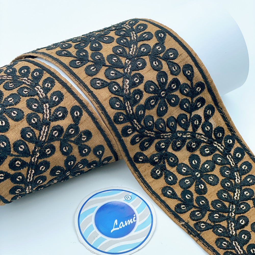 Enhance your designs with this sophisticated black embroidery lace on a rich gold base. The intricate leaf-inspired pattern adds a luxurious touch, making it ideal for ethnic wear, sarees, lehengas, dupattas, and home d?cor. Perfect for couture fashion and creative embellishments.