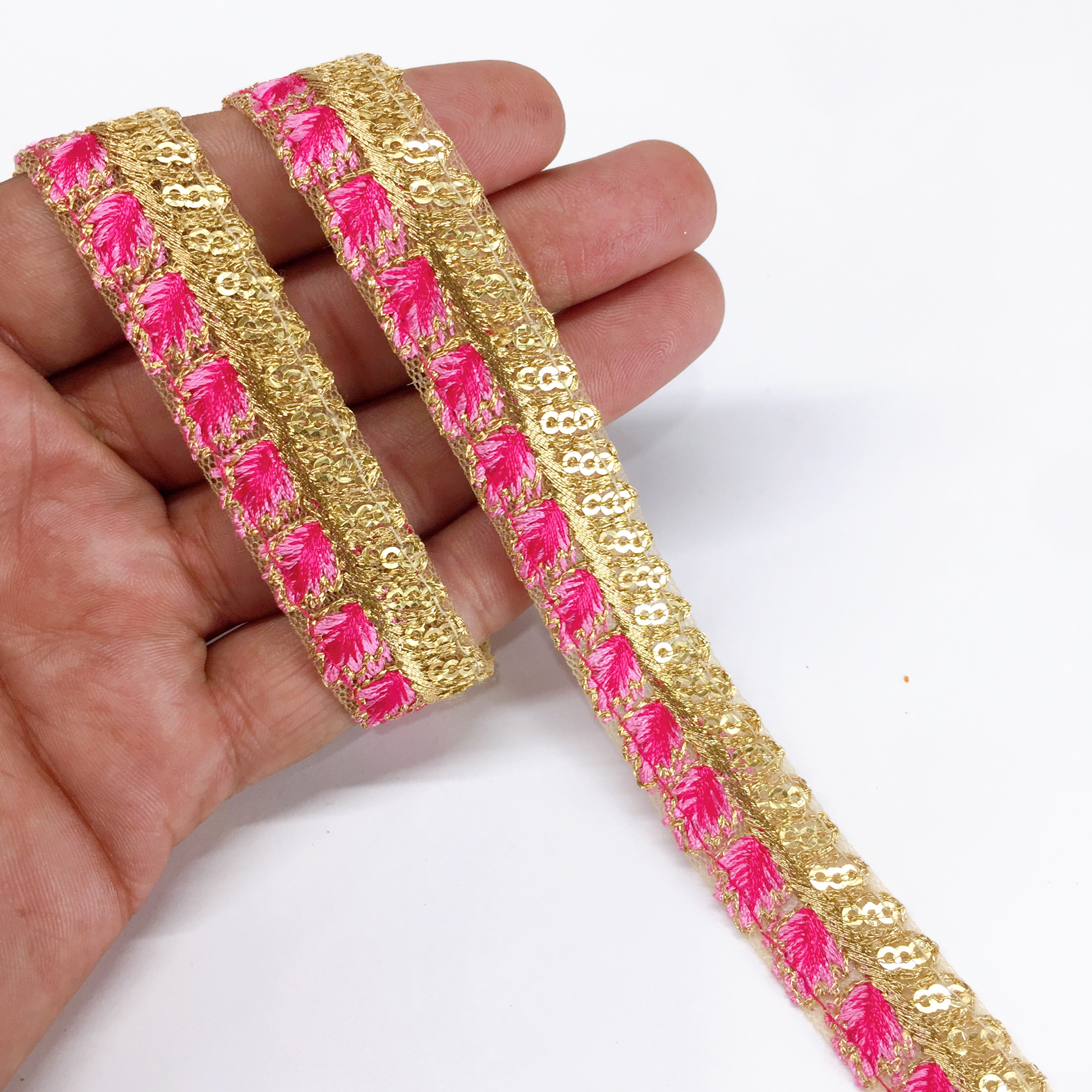 15mm Pink Leaf Design Embroidery lace with Golden Sequins Work Border - 9.00 meters